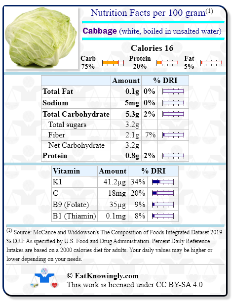 Nutrition Facts for Cabbage (white, boiled in unsalted water)